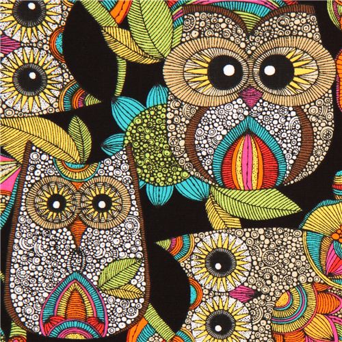 schwarzer Eulen Stoff mit bunten Eulen Robert Kaufman Stoff