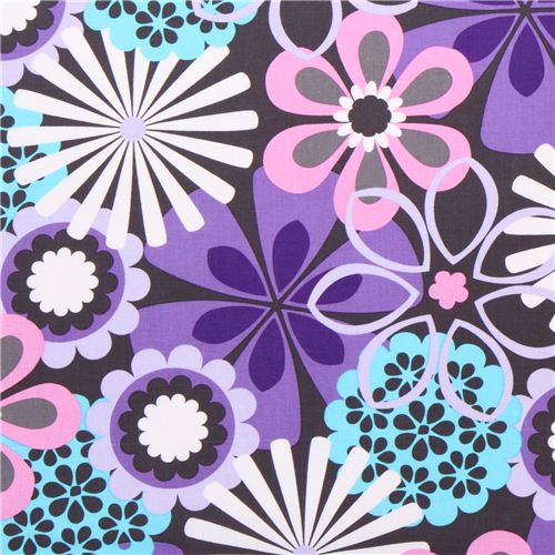 dunkelgrauer Baumwoll-Stoff mit vielen großen lila-türkis-weißen Blumen
