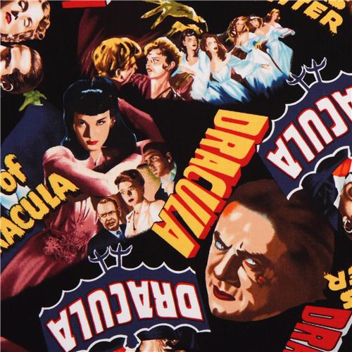schwarzer Baumwoll-Stoff mit Vampiren, Dracula und Filmplakaten