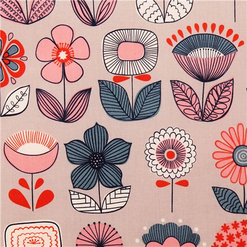 grauer laminerter Baumwoll-Stoff mit schönen roten, blauen und rosa Blumen