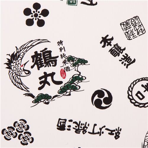 weißer Canvas-Baumwollstoff mit japanischen Schriftzeichen mit Etiketten von Sake-Reiswein