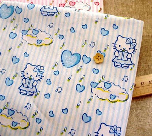 hell-blauer Stoff mit süsser Hello Kitty mit Geschenk, Herzen und Wolken; halber Meter