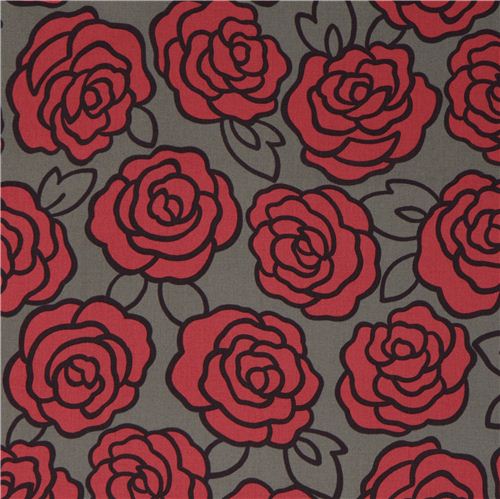 olivgrüner Baumwollstoff mit großen roten Rosenblüten und Blättern
