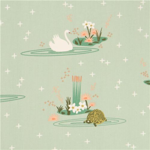 Mintgrüner Bio-Stoff mit Schwan Schildkröte Frosch Lilienblatt von birch USA Stoff