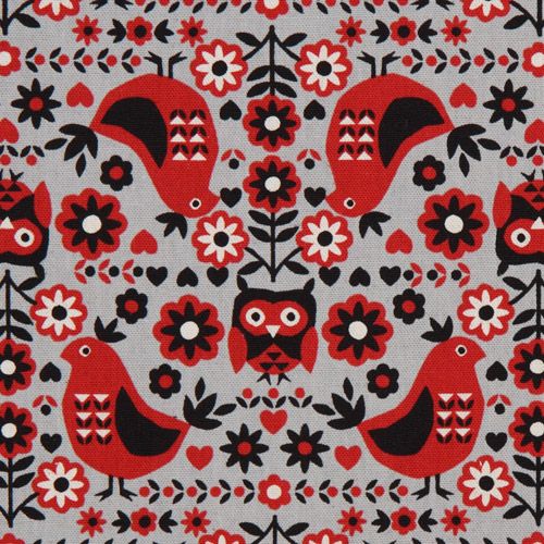 grauer Oxfordstoff mit roten Vögeln von Kokka Japan Stoff