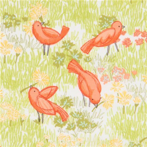 von Japanese IndieStoff mit Vögeln Weißer Baumwollstoff mit Gras und korallenroten Vögeln. Sehr hochwertiger Stoff in der typischen Qualität von Moda.