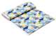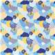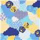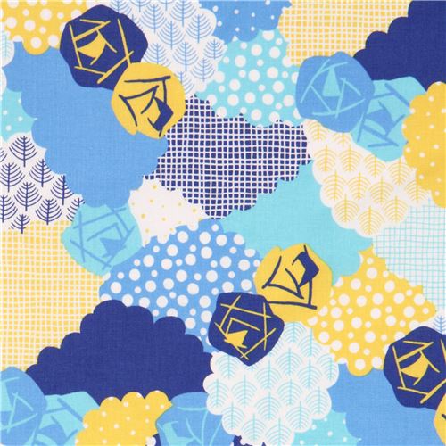 bunter Baumwollstoff mit blauen, hellblauen, dunkelblauen, gelben, hellcremefarbenen Tupfen, Blumen, Gittermustern etc.