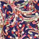 Marineblauer Stoff mit Bändern und Blüten. Marineblauer Baumwollstoff mit bunten Bändern mit Blüten und Glocken mit goldener Metallic-Verzierung.