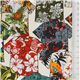 Cremefarbener Hawaiihemdstoff von Trans-Pacific Textiles hellcremefarbener Baumwollstoff mit Hawaiihemden mit Mustern wie Hibiskusblüten, Ananas usw.