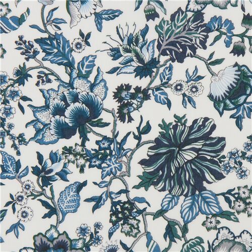 Weiß Tana Lawn Baumwolle Jakobiter Blume Stoff von Liberty Fabrics weißer leichter Baumwollstoff mit Blumen und Blätte in Petrolfarben, Dunkelgrün usw. Tana Lawn ist nach dem Tana-See in Äthiopien, Afrika, benannt, wo die ursprüngliche Baumwolle wuchs. Tana Lawn ist bekannt dafür, weich, seidenartig und farbenfroh zu sein. Der Druck erfolgt nach einer von Liberty Fabrics perfektionierten Methode, um sicherzustellen, dass jeder Stoff glatt, farbkräftig und von unglaublich hoher Qualität ist. Tana-Lawn-Stoffe werden in einer Stoffmanufaktur in Italien bedruckt.