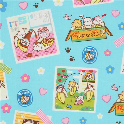 von Japanese IndieAquablau Bananya Foto Stoff aquablauer Baumwollstoff mit Katzen, Bananen, Bildern, Blumen, Herzen, Pfotenabdrücken usw.