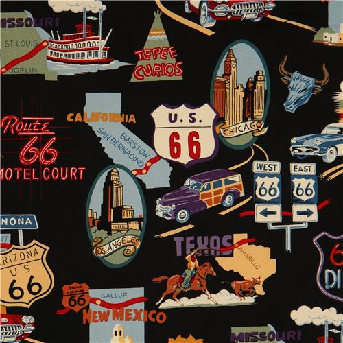 Schwarzer Route-66-Stoff schwarzer Stoff mit Namen von US-Bundesstaaten wie Arizona, Oaklahoma usw., mit Autos, Schildern usw.