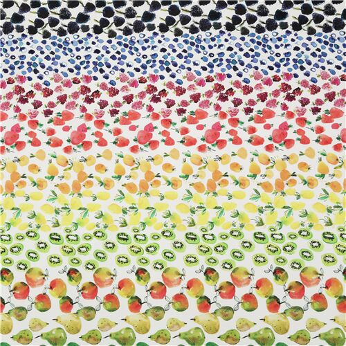 Regenbogen Früchte Stoff von Dear Stella weißer Baumwollstoff mit verschiedenen Aquarellfrüchten in einem Regenbogen mit Birnen, Kiwi, Zitrone, Pfirsichen, Erdbeeren und anderen Beeren