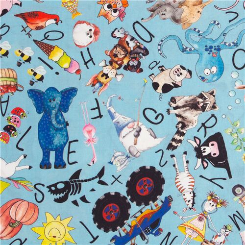 Blauer ABC-Stoff mit bunten Mustern hellblauer Baumwollstoff mit lustigen bunten bunten Kindern, Tieren, Dingen usw., die Buchstaben des Alphabets illustrieren sehr hochwertiger Stoff, typisch tolle Qualität aus den USA