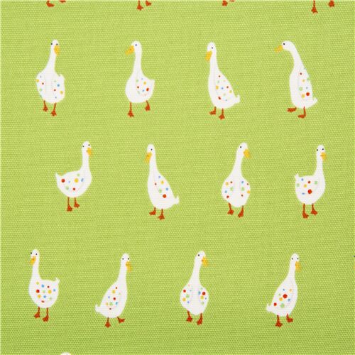 6 Grüner Oxfordstoff mit weißen Gänsen mit buntem Gefieder in Reihen Fabric by Japanese Indie - modeS4u
