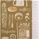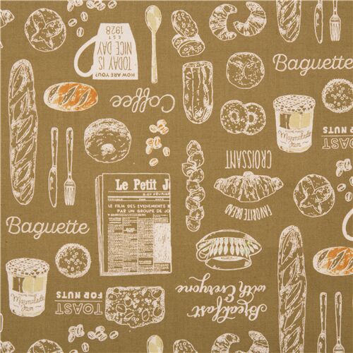 Japan brauner glatter Baumwollstoff mit Donuts Zeitungen Frühstück Baguettebrötchen Stoff