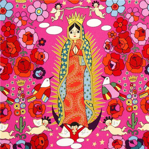 fuchsia cotton fabric with Mexican statues of Virgin Mary, colourful flowers, birds & gold embellishments