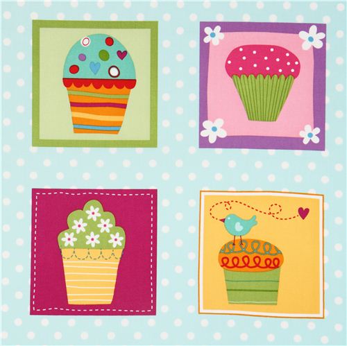 light blue cotton fabric with colourful squares with cupcakes, birds and polka dots