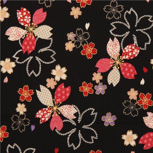 black cotton fabric with patterned cherry blossoms & gold embellishments