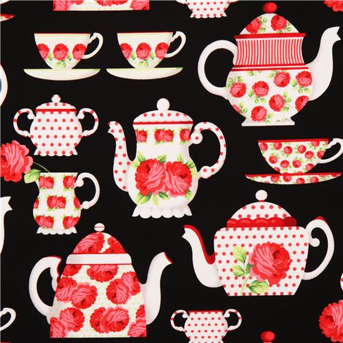 black cotton fabric with white tea set, red roses and dots