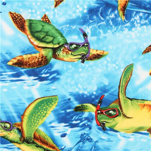 blue cotton fabric with turtles in the sea with goggles and snorkel
