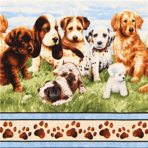animal fabric with puppies on a meadow in stripes by Greg Giordano