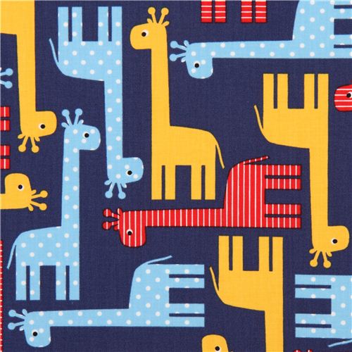 navy blue cotton fabric with funny blue, yellow & red giraffes