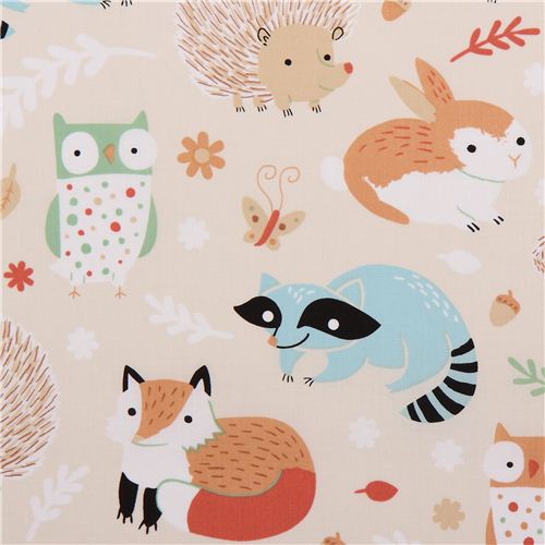 cream cotton fabric with fox, squirrel, hedgehog, rabbit, raccoon and owl