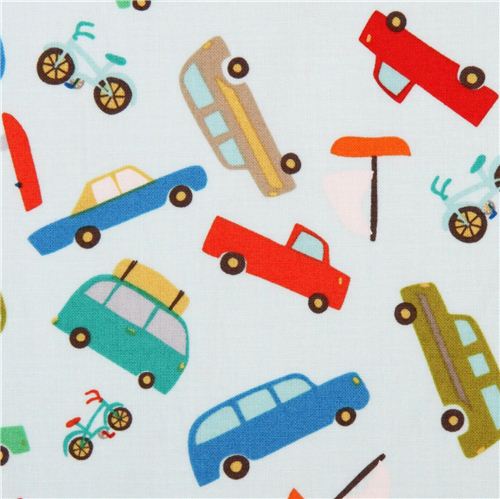 light blue cotton fabric with cars, boats and bikes