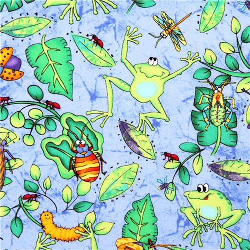 blue cotton fabric with frogs, bugs and insects