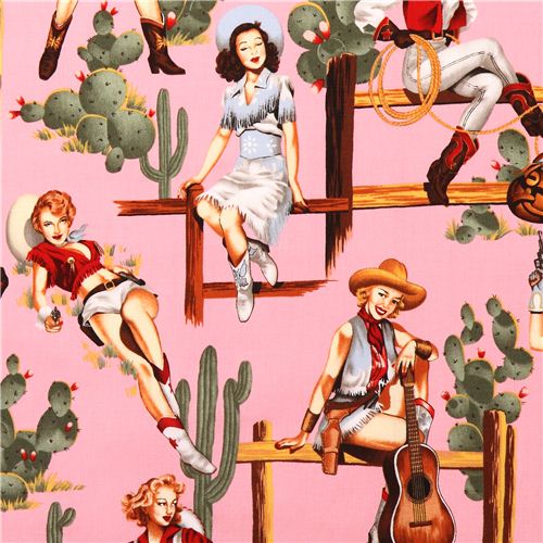pink retro fabric from the USA with Cowboy Pin-up girls with guns and horse