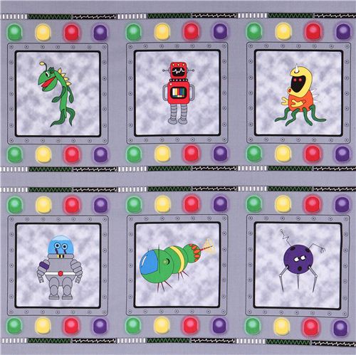 grey cotton fabric with squares with spaceships, aliens, robots etc.