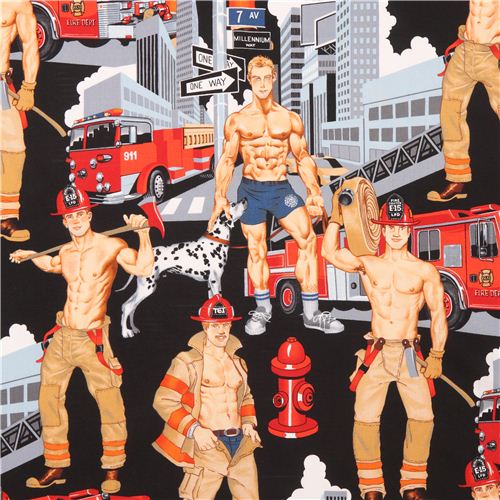 black designer fabric with retro pin-up firefighters, fire engines, hydrants etc.