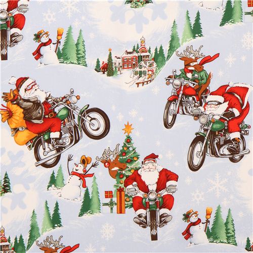 light blue cotton fabric with Santa Claus in leather jacket on motorbike