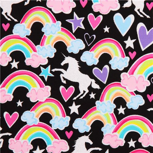 black fairy tale fabric from the USA with pink stars, hearts, rainbows, unicorns and silver glitter decoration