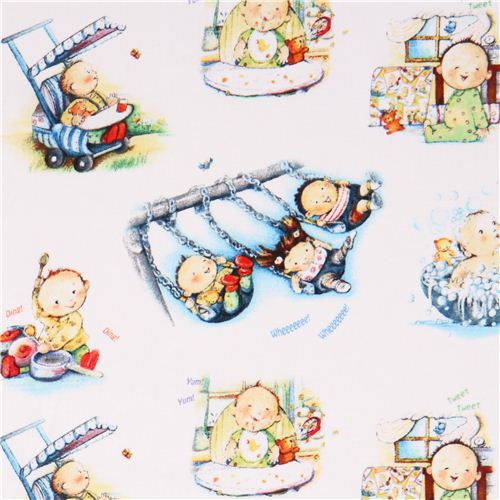 cute white cotton fabric with baby story pictures with babies playing, eating and taking a bubble bath