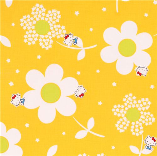 birght yellow Hello Kitty oxford fabric with little Hello Kitty cats and big white flowers from Japan