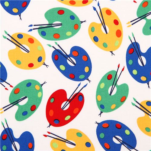 white art fabric from the USA with color palettes and brushes in blue, yellow, red and green