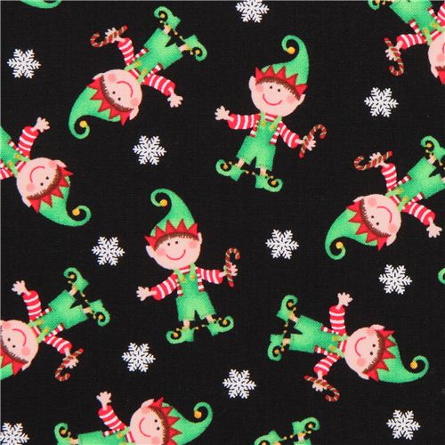 black cotton fabric with elves with candy cane and ice crystals