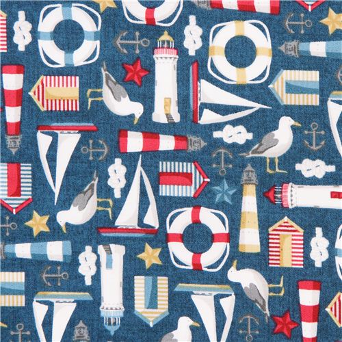 cute blue nautics fabric with marine rope, sailboat, anchor, seagull and light house etc.