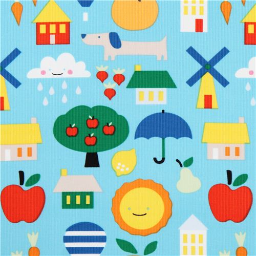 cute designer corduroy fabric by Rae Hoekstra from "Small World" with fruit, houses, dogs and balloons