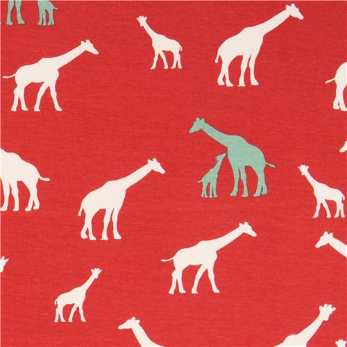 red interlock fabric with white and turquoise giraffes