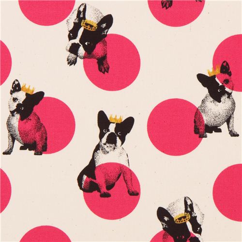 natural-cream colored animal fabric from Japan with pugs with crowns and hot pink dots