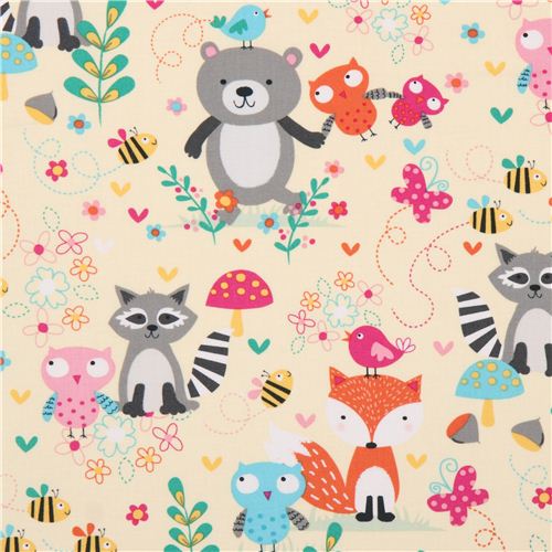 cute light yellow animal fabric with mushrooms, flowers, foxes, raccoons, owls, bees, bear etc.