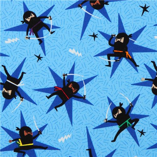 funny blue speckled fabric for boys with big stars and black ninjas with swords