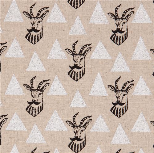 natural colored laminated canvas fabric with silver metallic triangles, funny black antelopes with mustaches