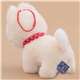 small cream and white dog plush toy with red and white bow tie, with chain