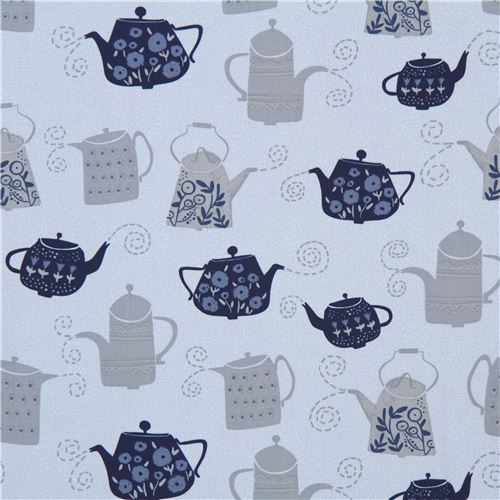 Tea Pots Fabric. light grey-blue cotton fabric with grey and dark blue tea pots very high quality fabric, typical great quality from the USA