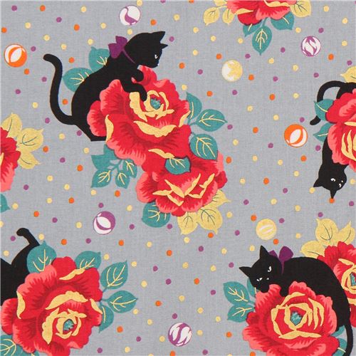 grey cotton fabric with cats, flowers, dots, with gold metallic embellishment