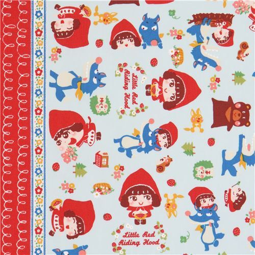 by Japanese IndieLittle Red Riding Hood Fabric. light turquoise-blue cotton printed Oxford fabric with double border, Little Red Riding Hood, wolf etc. very high quality fabric, typical perfect Japanese quality